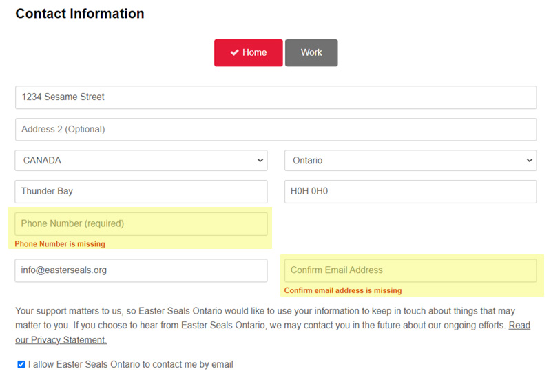 If you forget to fill out a mandatory field, the donation page will prevent you from moving forward in the process. The form will jump to the missing information and will display basic instructions highlighted in red. The most common instances are the phone number and the confirm email address fields not being completed.